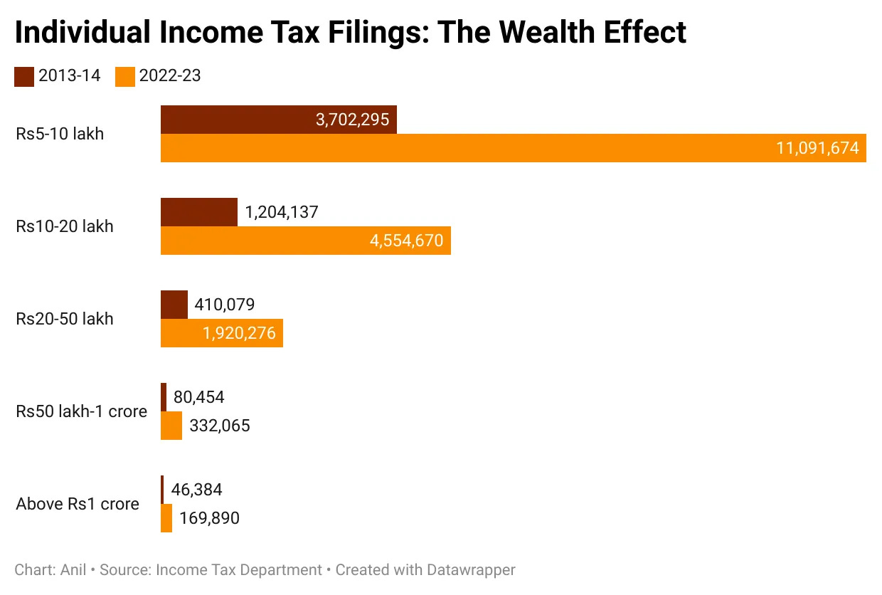 The graphic shared above is sourced from the same newsletter. It shows how there was a substantial jump in the number of tax filings for annual income in the band of Rs 5-10 lakh and Rs 10-20 lakh. The new tax bands announced by the FM tacitly acknowledge this trading up by eliminating the tax incidence on incomes less than Rs12 lakh.