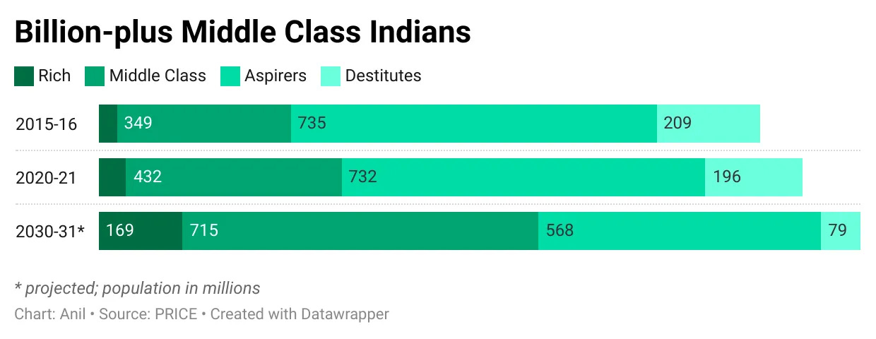 As the above graphic, sourced from PRICE (People’s Research on the Indian Consumer Economy), shows, the middle class cohort is substantial. At present, they are estimated to be around 40-50 crore and are projected to grow to 71.5 crore by 2030. To be sure the middle class is not a homogenous entity and is variegated across income groups.