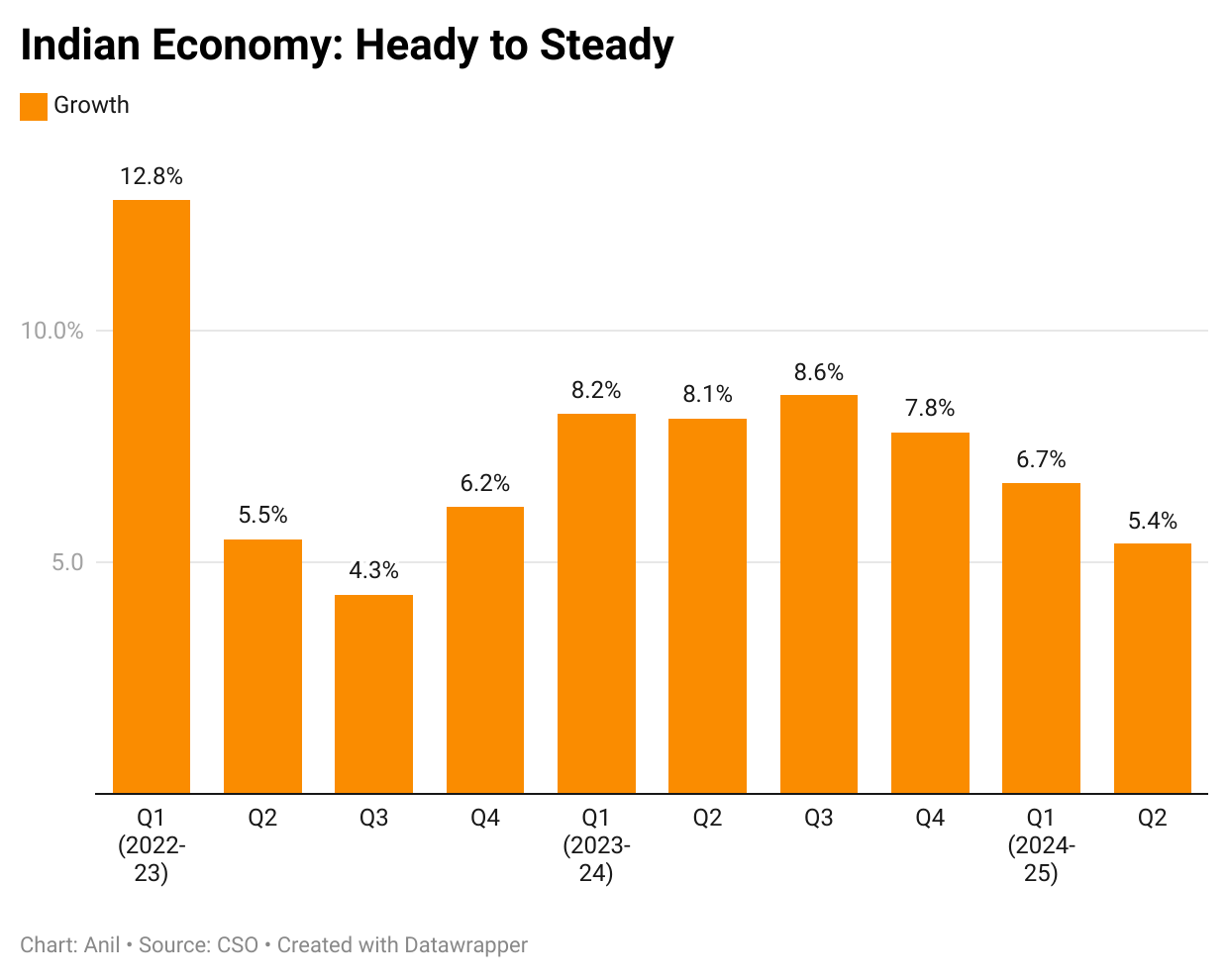 Last week the Central Statistical Office (CSO) shared the latest numbers on the Indian economy. It was a shocker: growth in the second quarter of 2024-25 ended September came in at 5.4%—substantially below the expected 7% and also the lowest in seven quarters.
